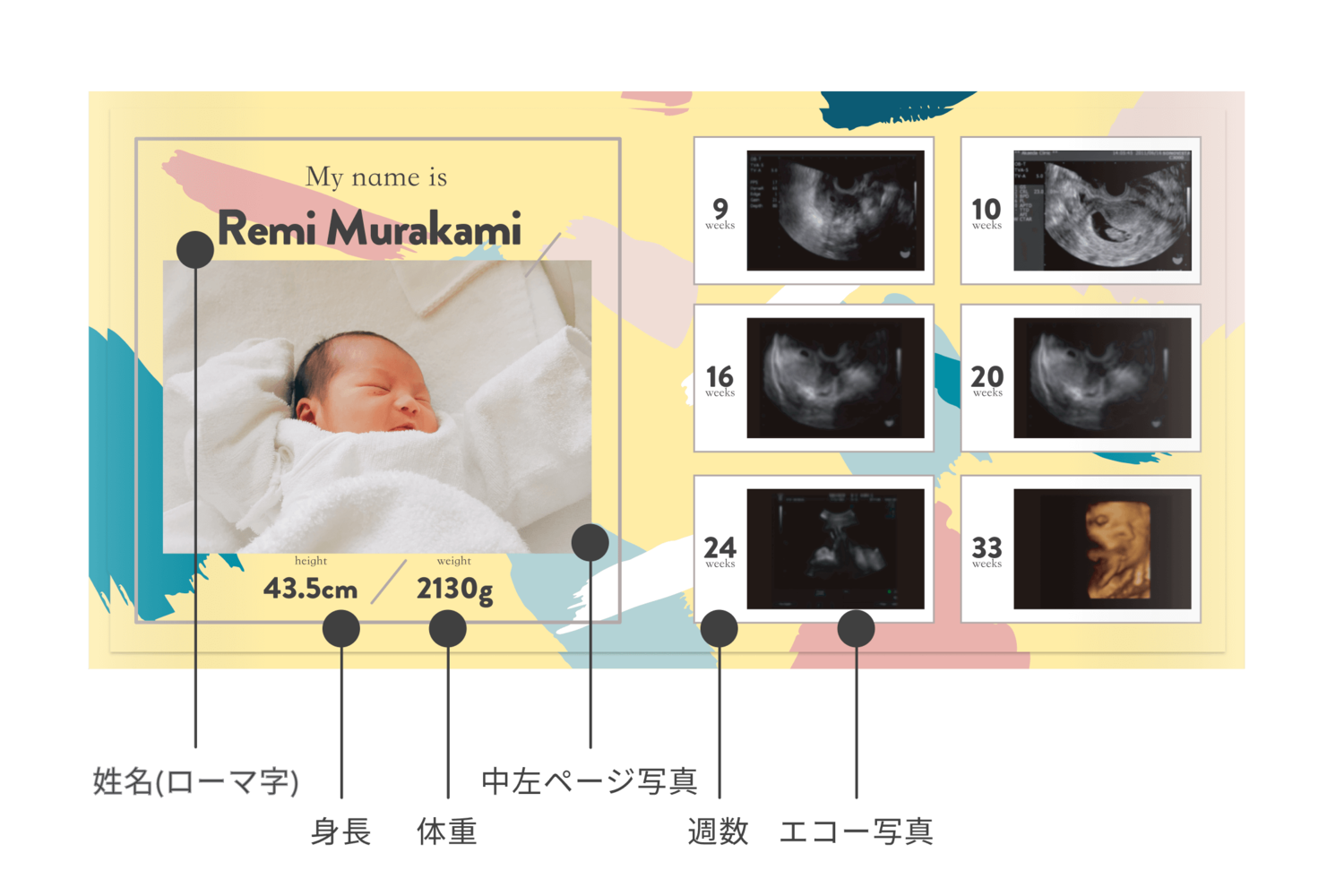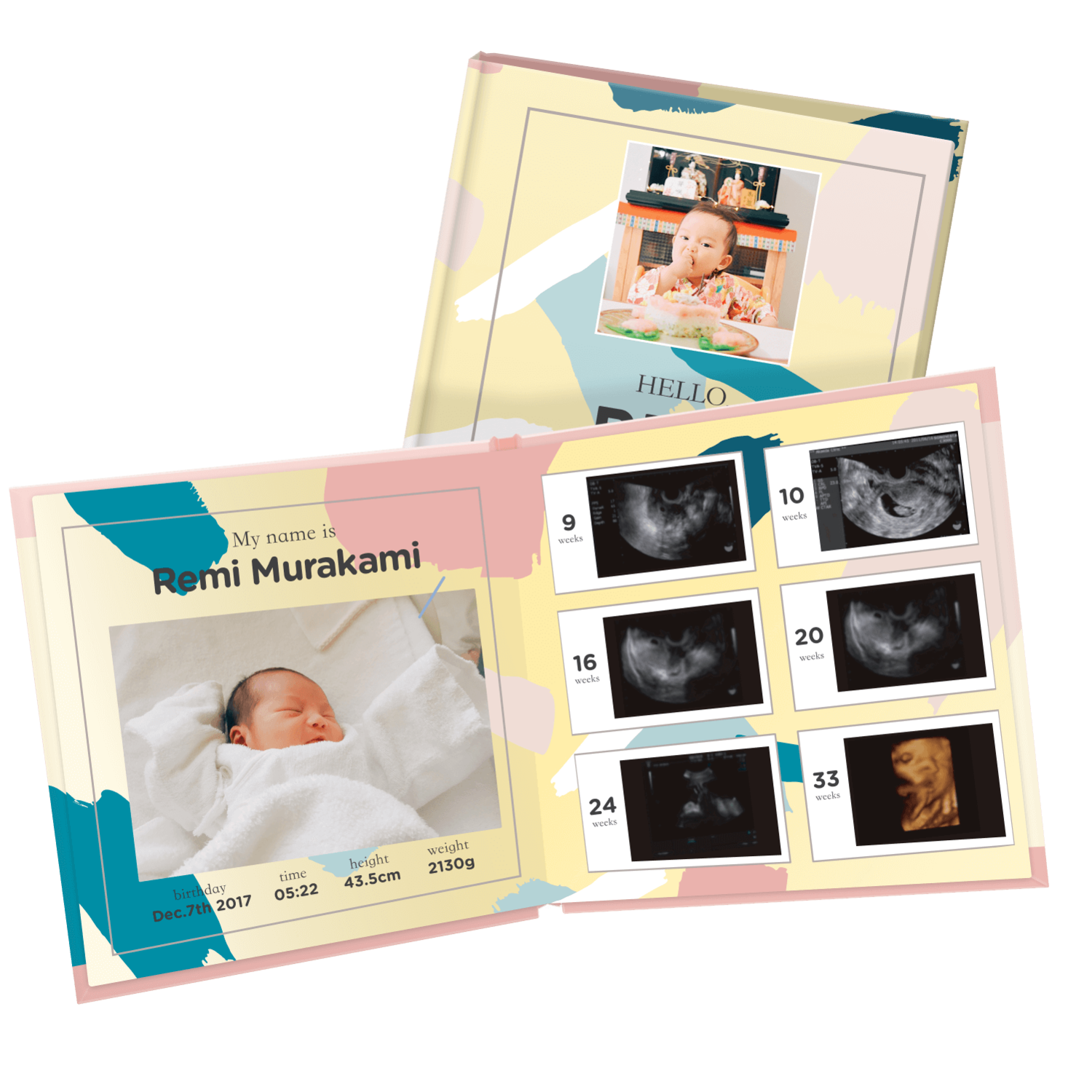 お子様のお腹で過ごした思い出から誕生までの軌跡を一つのベビーアルバムに。エコー写真もいつでも振り返ることができます。
